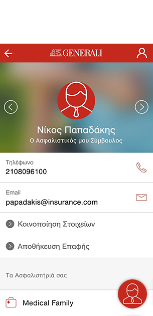 Επικοικώνησε με τον Ασφαλιστικό σου Σύμβουλο μέσω email ή τηλεφωνικά και δες όλες τις πληροφορίες και τα στοιχεία επικοινωνίας του συγκεντρωμένα μέσα από το προφίλ του.